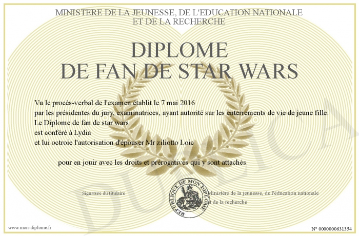 Envoyez par email votre Diplôme de fan de star wars personalisé