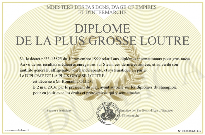 Envoyez par email votre Diplôme DE LA PLUS GROSSE LOUTRE personalisé