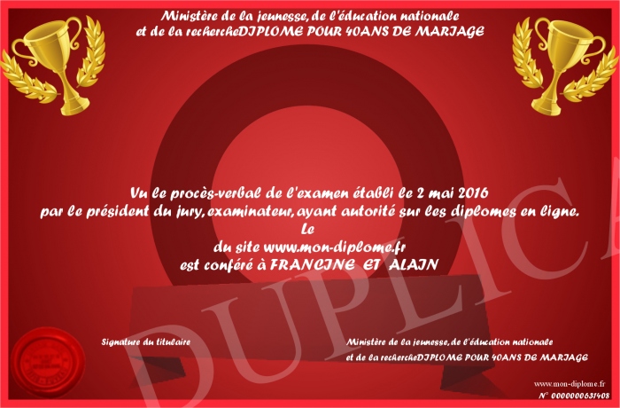 envoyé par le Ministère de la jeunesse, de l'éducation nationale-et de la rechercheDIPLOME POUR 40ANS DE MARIAGE !