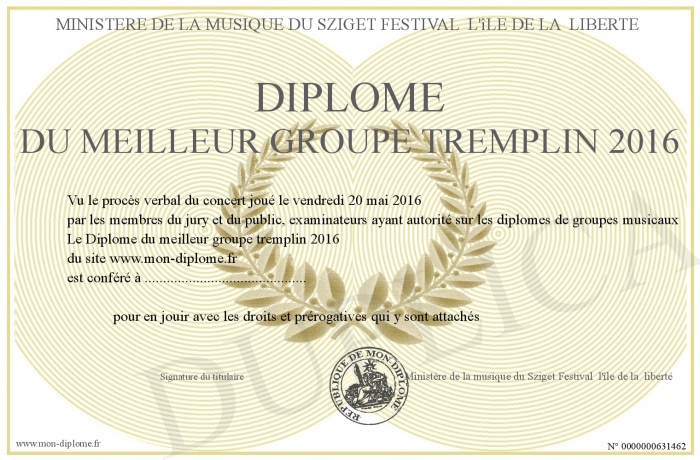 Envoyez par email votre Diplôme du meilleur groupe tremplin 2016 personalisé