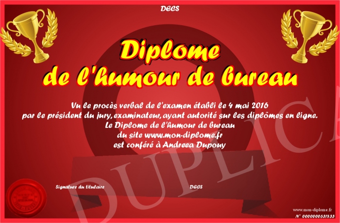 Envoyez par email votre Diplôme de l'humour de bureau personalisé