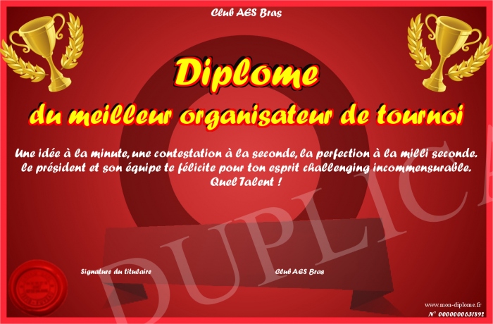 Envoyez par email votre Diplôme du meilleur organisateur de tournoi personalisé
