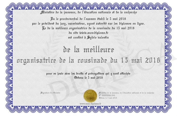 Envoyez par email votre de la meilleure organisatrice de la cousinade du 15 mai 2016 personalisé