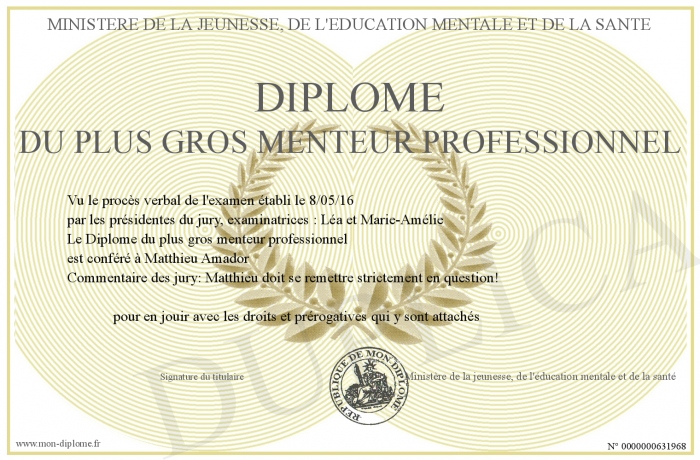 Envoyez par email votre Diplôme du plus gros menteur professionnel personalisé