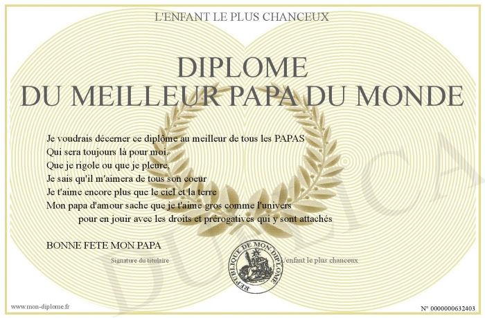 Envoyez par email votre Diplôme du meilleur papa du monde personalisé