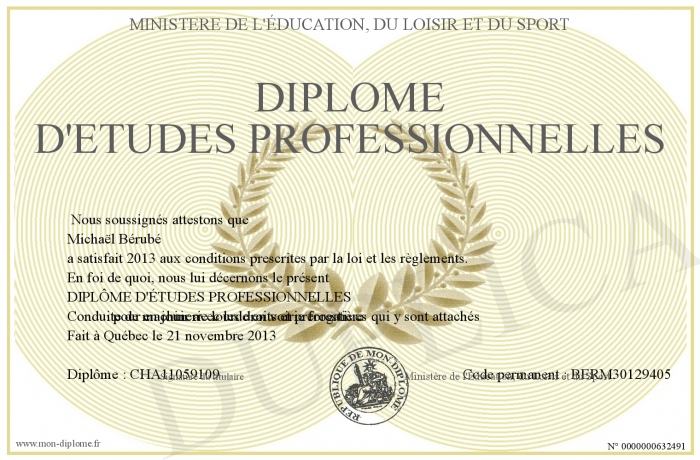 Envoyez par email votre Diplôme d'études professionnelles personalisé