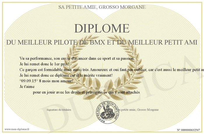 Envoyez par email votre Diplôme du meilleur pilote de BMX et du meilleur petit ami personalisé