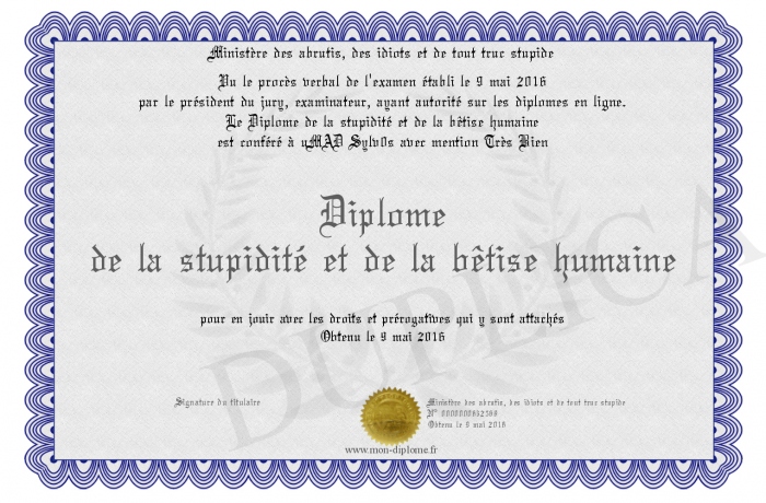 Envoyez par email votre Diplôme de la stupidité et de la bêtise humaine personalisé