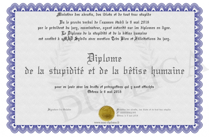 Envoyez par email votre Diplôme de la stupidité et de la bêtise humaine personalisé
