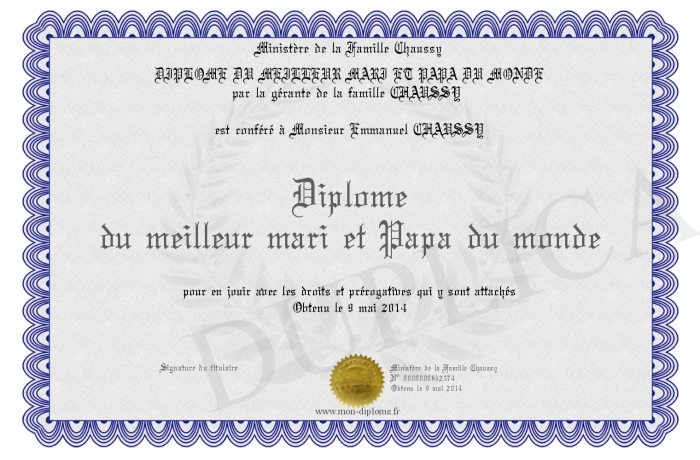 Envoyez par email votre Diplôme du meilleur mari et Papa du monde personalisé