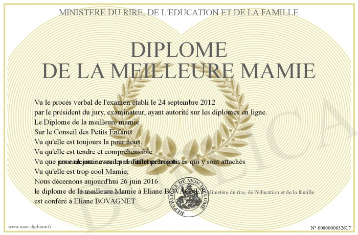 Envoyez par email votre Diplôme de la meilleure mamie personalisé