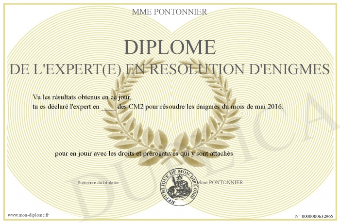 Envoyez par email votre Diplôme de l'expert(e) en résolution d'énigmes personalisé