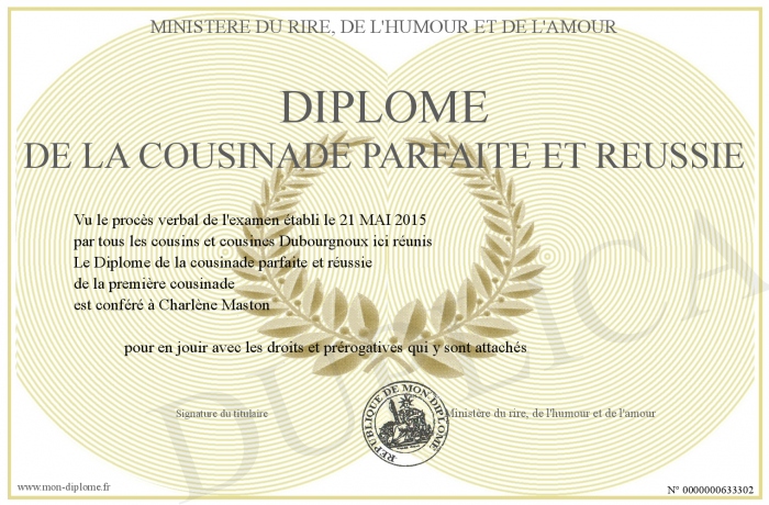 Envoyez par email votre Diplome de la cousinade parfaite et réussie personalisé