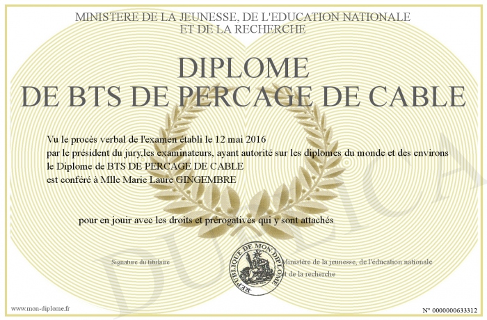 Envoyez par email votre Diplome de BTS DE PERCAGE DE CABLE personalisé