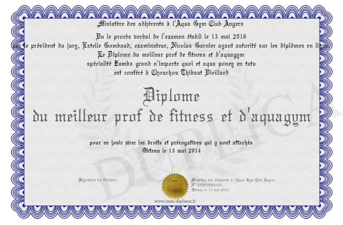 Envoyez par email votre Diplôme du meilleur prof de fitness et d'aquagym personalisé