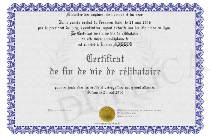 Envoyez par email votre Certificat de fin de vie de célibataire personalisé