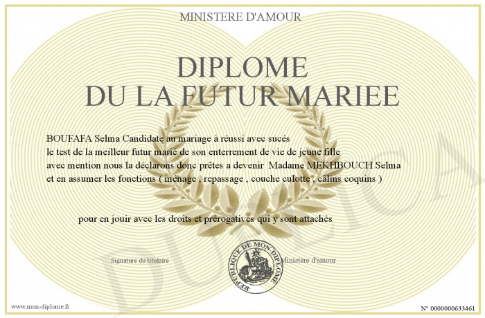 Envoyez par email votre Diplôme du la futur mariée personalisé