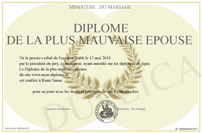 Envoyez par email votre Diplôme de la plus mauvaise épouse personalisé
