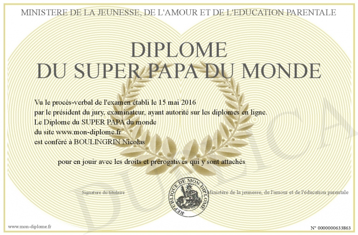 Envoyez par email votre Diplôme du SUPER PAPA du monde personalisé