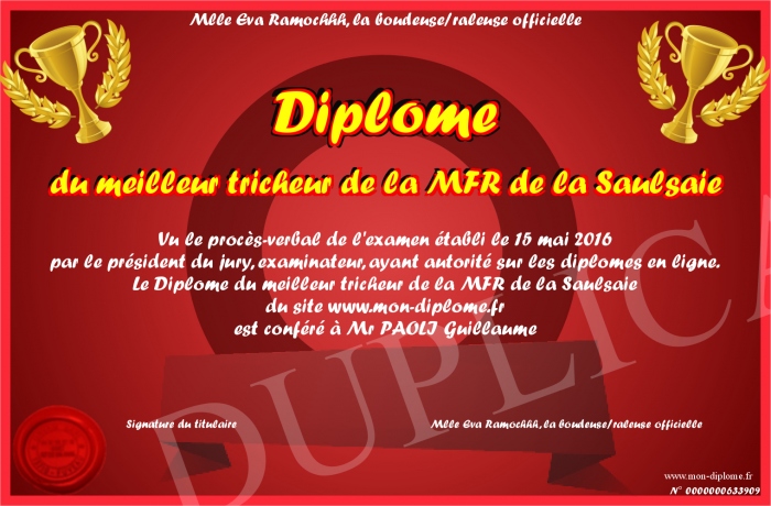 Envoyez par email votre Diplôme du meilleur tricheur de la MFR de la Saulsaie personalisé