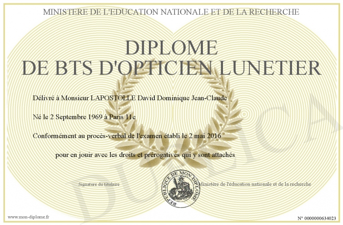 Envoyez par email votre Diplome de BTS d'Opticien Lunetier personalisé