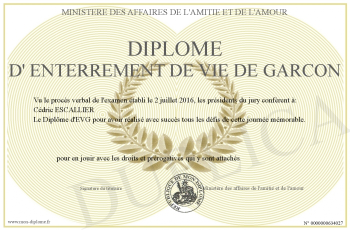 Envoyez par email votre Diplôme d' enterrement de vie de garcon personalisé