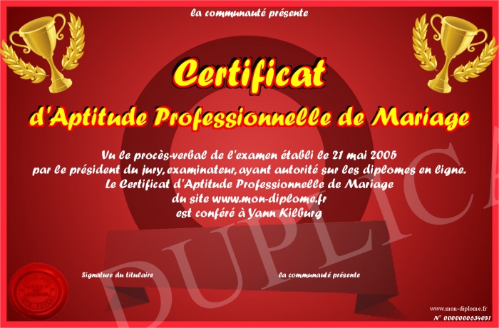 Envoyez par email votre Certificat d'Aptitude Professionnelle de Mariage personalisé