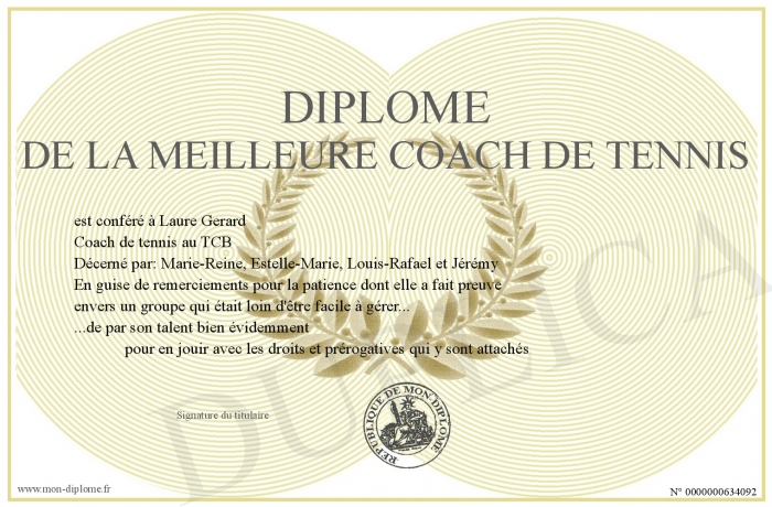 Envoyez par email votre diplome de la meilleure coach de tennis personalisé