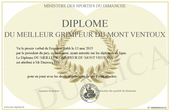 Envoyez par email votre Diplôme DU MEILLEUR GRIMPEUR DU MONT VENTOUX personalisé