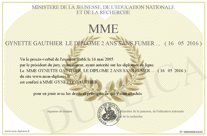 Envoyez par email votre MME GYNETTE GAUTHIER LE DIPLOME 2 ANS SANS FUMER ... ( 16 05 2016 ) personalisé