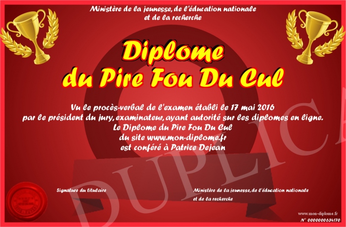 Envoyez par email votre Diplôme du Pire Fou Du Cul personalisé