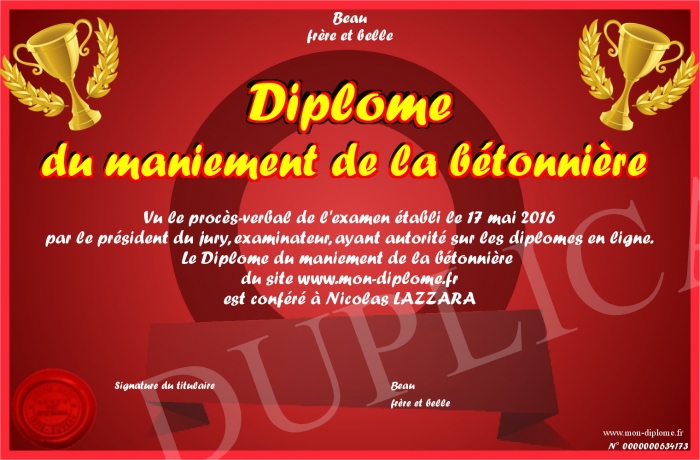 Envoyez par email votre Diplôme du maniement de la bétonnière personalisé
