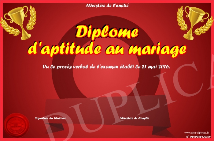 Envoyez par email votre Diplome d'aptitude au mariage personalisé