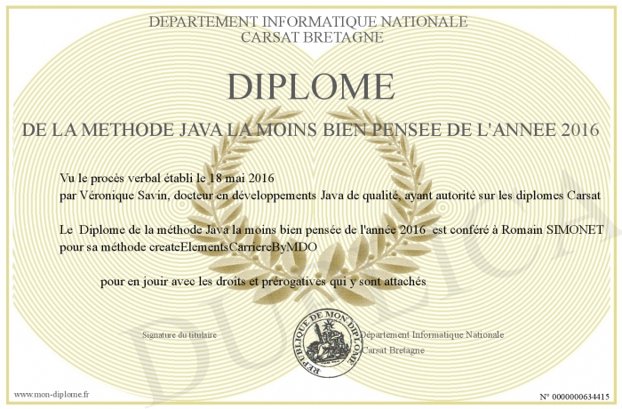 Envoyez par email votre Diplôme de la méthode Java la moins bien pensée de l'année 2016 personalisé