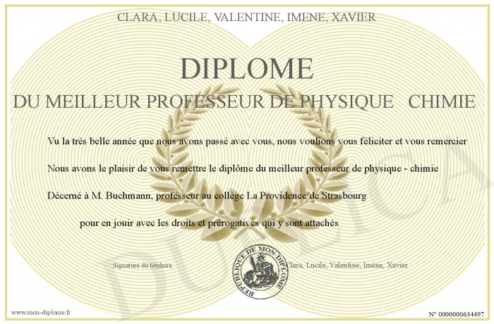 Envoyez par email votre Diplôme du meilleur professeur de physique chimie personalisé