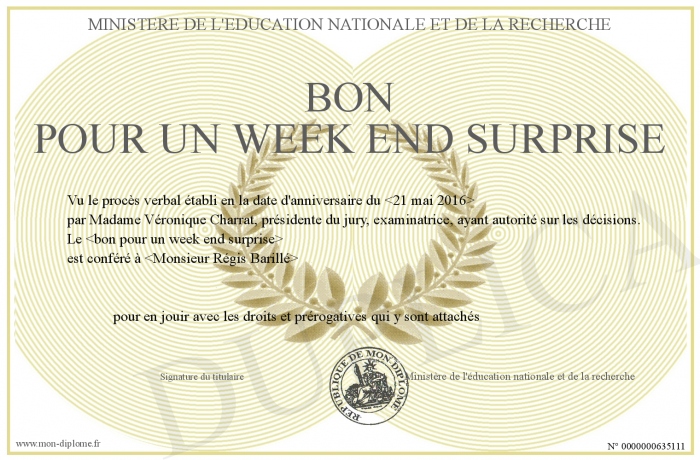 Envoyez par email votre Bon pour un week end surprise personalisé