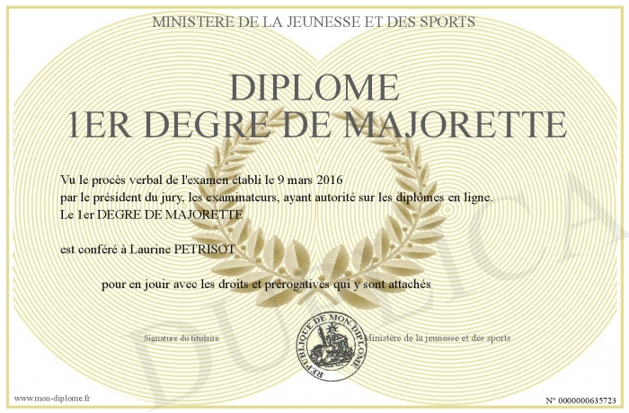 Envoyez par email votre Diplôme 1er DEGRE DE MAJORETTE personalisé