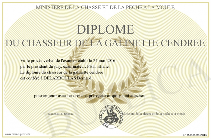 Envoyez par email votre Diplôme du chasseur de la galinette cendrée personalisé