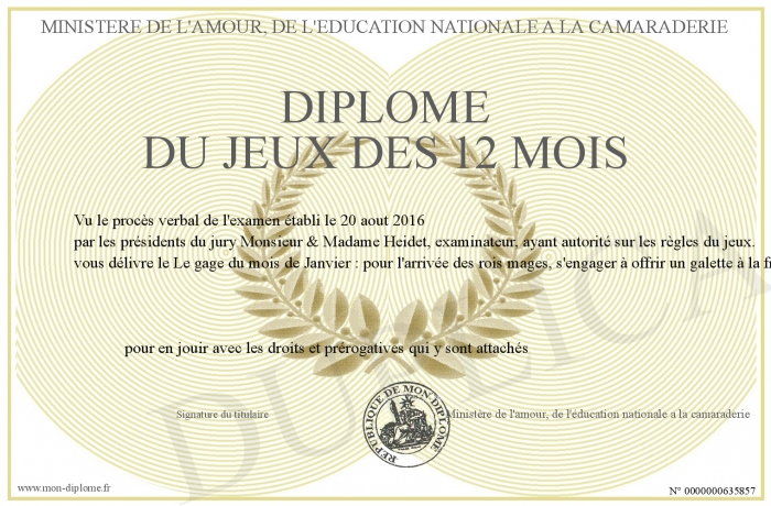 Envoyez par email votre Diplôme du jeux des 12 mois personalisé