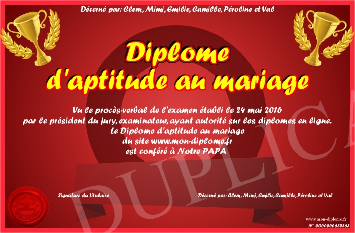 Envoyez par email votre Diplome d'aptitude au mariage personalisé
