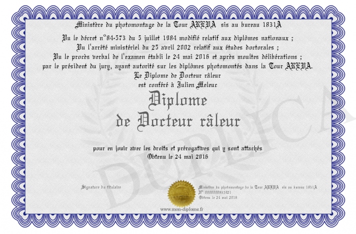 Envoyez par email votre Diplôme de Docteur râleur personalisé