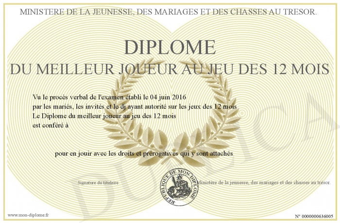 Envoyez par email votre Diplôme du meilleur joueur au jeu des 12 mois personalisé