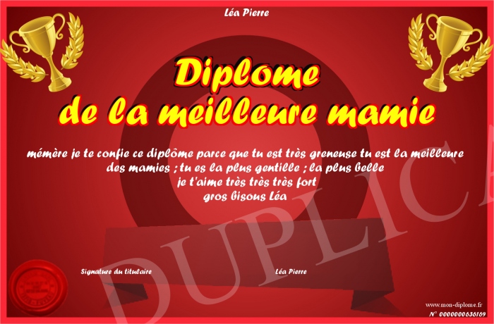 Envoyez par email votre Diplôme de la meilleure mamie personalisé