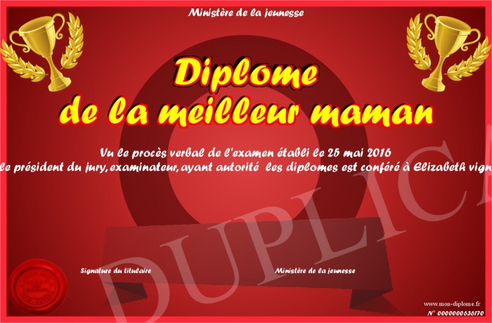 Envoyez par email votre Diplôme de la meilleur maman personalisé