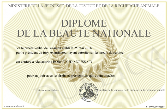 Envoyez par email votre Diplôme de la beauté nationale personalisé