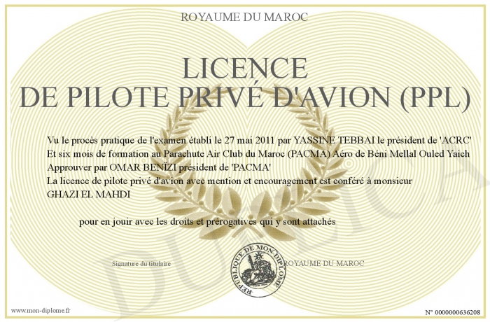 Envoyez par email votre LICENCE DE PILOTE PRIVÉ D'AVION (PPL) personalisé