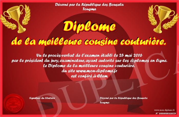 Envoyez par email votre Diplôme de la meilleure cousine couturière. personalisé