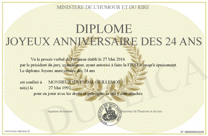 Envoyez par email votre Diplôme Joyeux anniversaire des 24 ans personalisé