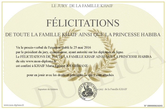 Envoyez par email votre FÉLICITATIONS DE TOUTE LA FAMILLE KHAIF AINSI QUE LA PRINCESSE HABIBA personalisé