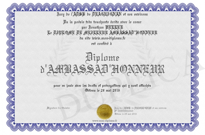 Envoyez par email votre Diplome d'AMBASSAD'HONNEUR personalisé